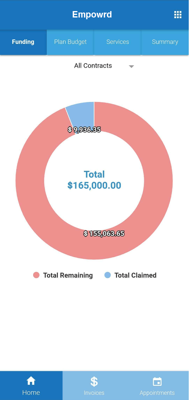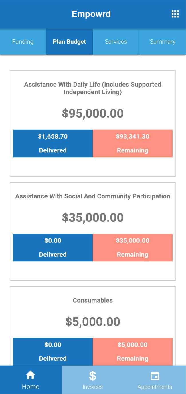 This is for the participant and is a mobile App. They can see full funding, approve/reject invoices if they wish and see all data associated with their plan.